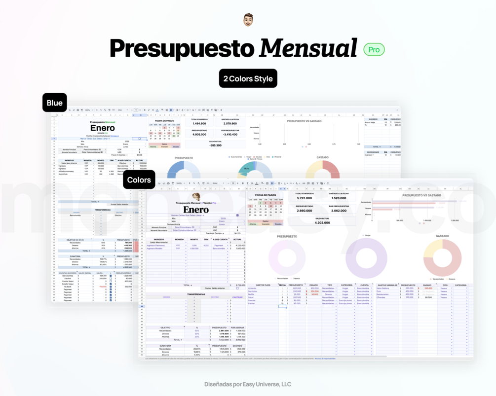 Utilizada por cientos de personas para tomar el control de su dinero, esta hoja de presupuesto mensual está basada en la reconocida metodología 50-30-20: una forma práctica y clara de dividir tus ingresos entre necesidades, deseos y ahorro.